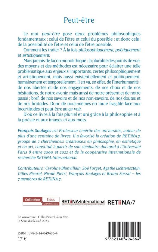 Le mot peut-être pose deux problèmes philosophiques fondamentaux : celui de l'être et celui du possible ; et donc celui de la possibilité de l'être et celui de l'être possible. Comment les traiter ? À la fois philosophiquement, poétiquement et artistiquement. Mais jamais de façon monolithique : la pluralité des points de vue, des moyens et des méthodes est nécessaire pour éclairer une telle problématique aux enjeux si importants, certes philosophiquement et artistiquement, mais aussi existentiellement et politiquement, humainement et temporellement. Il en va, en effet, de l'interhumanité : de nos libertés et de nos engagements, de nos choix et de nos hésitations, de notre avenir, mais aussi de notre présent et de notre passé ; bref, de nos savoirs et de nos non-savoirs, de nos doutes et de nos finitudes. Donc de nous-mêmes en toute fragilité face aux incertitudes et peut-être au ça-voir. D'où ce livre à la fois pluriel et uni grâce à la philosophie et à la poésie et aux images et aux mots.