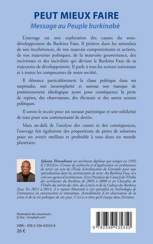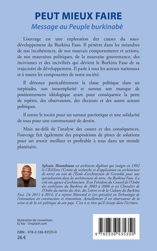 L'ouvrage est une exploration des causes du sous-développement du Burkina Faso. Il pénètre dans les méandres de nos incohérences, de nos mauvais comportements et actions, de nos mauvaises politiques, de la mauvaise gouvernance, des incivismes et des incivilités qui dévient le Burkina Faso de sa trajectoire de développement. Il parle à tous les acteurs nationaux et à toutes les composantes de notre société.