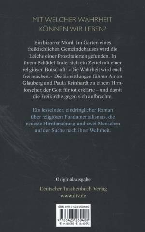 Ein bizarrer Mord: Im Garten eines freikirchlichen Gemeindehauses wird die Leiche einer Prostituierten gefunden. In ihrem Schädel findet sich ein Zettel mit einer religiösen Botschaft: »Die Wahrheit wird euch frei machen.« Als der Kriminalbeamte Anton Glauberg vom Tatort nach Hause kommt, sitzt überraschendseine ehemalige Kollegin Paula Reinhardt vor der Tür. Reinhardt war vor Jahren selbst wegen Mordes verurteilt worden - jetzt ist sie auf Bewährung wieder frei. Glauberg nimmt Paula mit auf seine Ermittlungen, die ihn bald zu einem Forscher am Max-Planck-Institut für Neurobiologie führen.Dieser hatte aus wissenschaftlicher Perspektive Gott für tot erklärt - und damit die Vertreter der Freikirche gegen sich aufgebracht.