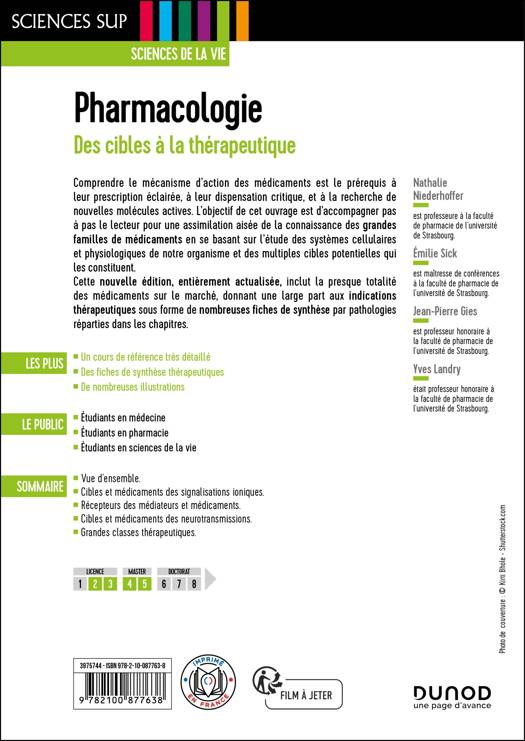 Comprendre le mécanisme d’action des médicaments est le prérequis à leur prescription éclairée, à leur dispensation critique, et à la recherche de nouvelles molécules actives. Cette compréhension est l’objectif de cet ouvrage qui a, dès sa première édition, totalement renouvelé l’approche pédagogique de la pharmacologie. Il  s’adresse aux étudiants en médecine, pharmacie et sciences de la vie, mais aussi à tous les professionnels de santé qui y trouveront les  connaissances et les concepts les plus récents.