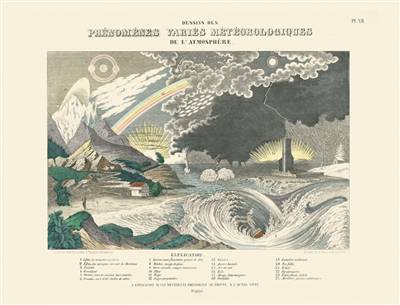 Tirée de « l'Astronomie populaire ou description des corps célestes avec atlas en tableaux transparents composé de 12 planches coloriées à l'usage des gens du monde. Cinquième édition soigneusement revue » publiée en 1879 par la librairie franco-belge klessling, cette carte, qui reprend une planche de John Emslie et James Reynolds, recense et illustre une vingtaine de phénomènes atmosphériques, océaniques et astronomiques, des feux follets aux trombes marines.