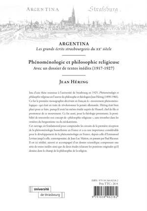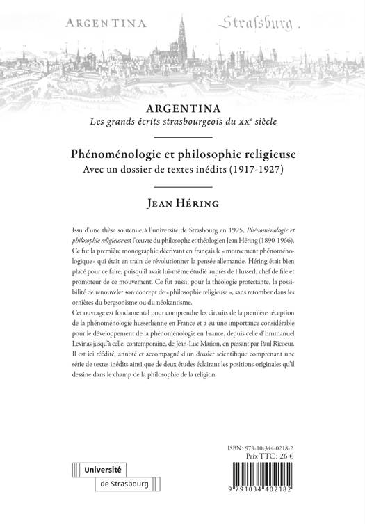 Issu d’une thèse soutenue à l’université de Strasbourg en 1925, Phénoménologie et philosophie religieuse est l’œuvre du philosophe et théologien Jean Héring (1890-1966). Ce fut la première monographie décrivant en français le « mouvement phénoménologique » qui était en train de révolutionner la pensée allemande. Héring était bien placé pour ce faire, puisqu’il avait lui-même étudié auprès de Husserl, chef de file et promoteur de ce mouvement. Ce fut aussi, pour la théologie protestante, la possibilité de renouveler son concept de « philosophie religieuse », sans retomber dans les ornières du bergsonisme ou du néokantisme.
