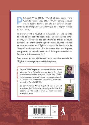 Philibert Vrau (1829-1905) et son beau-frère Camille Féron-Vrau (1831-1908), entrepreneurs de l'industrie textile, ont été des acteurs importants du développement économique de la région lilloise au XIXe siècle. Ils traversèrent la révolution industrielle avec la volonté de faire de leur activité économique une entreprise chrétienne, très soucieux des conditions de travail de leurs ouvriers. Ils contribuèrent également aux Åuvres sociales et intellectuelles de l'Église à travers la fondation de l'Institut catholique de Lille, devenant ainsi des figures marquantes du catholicisme social. Leur procès en béatification a été ouvert en 1912. Des prières et des réflexions sur la doctrine sociale de l'Église accompagnent ce récit inspirant. Le père Will Conquer est prêtre des Missions étrangères de Paris. Actuellement au Cambodge, il est conseiller spirituel en Asie pour l'UNIAPAC.