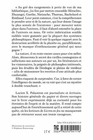 " Au gre des rangements a perte de vue de ma bibliotheque, j'ai fini par mettre ensemble Heraclite, Zhuangzi, Goethe, Nietzsche, Thoreau, Bachelard et Rimbaud. Leur point commun, c'est la comprehension (" prendre avec ") de la nature, qui leur donne l'image la plus sensee de l'existence: pour mesurer notre place dans l'univers, il faut d'abord entendre la place de l'univers en nous. Or cette imbrication semble oubliee voire gommee par la plupart des systemes philosophiques. Faut-il voir la quelque rapport avec la destruction acceleree de la planete ou, parallelement, avec le manque d'enthousiasme general qui nous gagne ? La nature, il en reste encore assez pour s'en meler. Alors, decouvrons le secret des vieilles cosmogonies et sollicitons nos auteurs un par un, les litterateurs et les visionnaires, la poignee de philosophes interesses, puis les erudits de l'ecologie si pleins de verdeur - afin de moissonner les recettes d'une attitude plus confortable. Elles risquent de surprendre. Car, a force de cerner l'intelligence du monde, on va voir que c'est un mystere a double tranchant. "