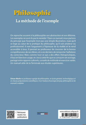 On reproche souvent à la philosophie son abstraction et son élitisme. Les exemples ne sont-ils pas le remède ? Dans ce manuel, nous partons du principe que l’exemple n’est pas une simple illustration, mais qu’il se loge au cœur de la pratique du philosophe, qu’il soit amateur ou professionnel. Il met l’argument à l’épreuve de la réalité et le rend accessible à tous. Il permet au professeur de s’assurer de la bonne compréhension de ses élèves, et à ses derniers de remporter l’adhésion du correcteur. Mais comme tout ce qui a des effets thérapeutiques, il faut en faire bon usage, et c’est à cette fin que se consacre cet ouvrage, partagé entre apports culturels, conseils de méthode et exercices variés. Un manuel utile de la terminale aux études supérieures.