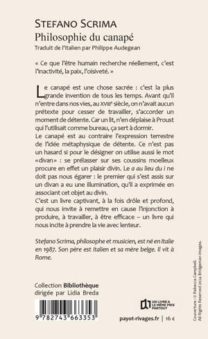 Le divan est une chose sacrée ; et c'est la plus grande invention de tous les temps. Avant qu'il n'entre dans nos vies (à partir du XVIIIe siècle), on n'avait aucun prétexte pour s'arrêter de travailler et aller se détendre. Car un lit, n'en déplaise à Proust qui l'utilisait comme bureau, c'est fait pour dormir. Le divan, au contraire, est l'expression terrestre de l'idée métaphysique de détente.