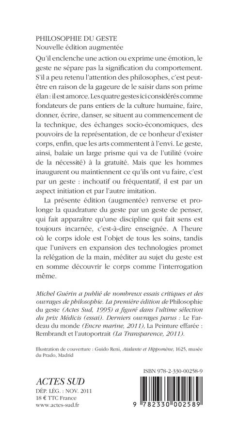 Cette édition augmentée de «Philosophie du geste», ouvrage paru en 1995, reprend le texte d'origine et en conserve le titre, tout en y incluant également un essai récent intitulé «Le Geste de penser.»