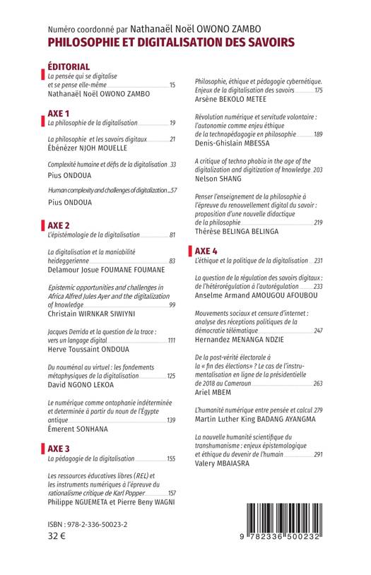 La revue philosophique de Yaoundé (REPHY) a pour objectif général de renforcer la qualité de la recherche et des publications scientifiques au sein du Département de Philosophie, d'une part, et d'autre part, d'encourager la coopération scientifique ainsi que le partage et la circulation des savoirs. Ce numéro propose 4 axes de réflexion autour de la philosophie et digitalisation des savoirs: La philosophie de la digitalisation, l'épistémologie de la digitalisation, la pédagogie de la digitalisation et l'éthique et la politique de la digitalisation.