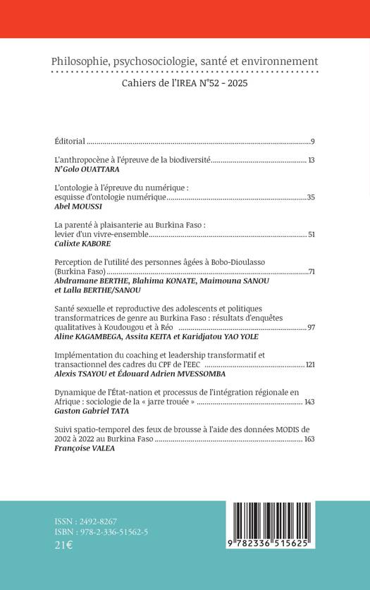 L'anthropocène à l'épreuve de la biodiversité de N'Golo OUATTARA L'ontologie à l'épreuve du numérique: esquisse d'ontologie numérique de Abel MOUSSI La parenté à plaisanterie au Burkina Faso: levier d'un vivre-ensemble de Calixte KABORE Perception de l'utilité des personnes âgées à Bobo-Dioulasso (Burkina Faso) de Abdramane BERTHE, Blahima KONATE, Maimouna SANOU et Lalla BERTHE/SANOU Santé sexuelle et reproductive des adolescents et politiques transformatrices de genre au Burkina Faso: résultats d'enquêtes qualitatives à Koudougou et à Réo de Aline KAGAMBEGA, Assita KEITA et Karidjatou YAO YOLE Implémentation du coaching et leadership transformatif et transactionnel des cadres du CPF de l'EEC de Alexis TSAYOU et Édouard Adrien MVESSOMBA Dynamique de l'État-nation et processus de l'intégration régionale en Afrique: sociologie de la jarre trouée de Gaston Gabriel TATA Suivi spatio-temporel des feux de brousse à l'aide des données MODIS de 2002 à 2022 au Burkina Faso de Françoise VALEA