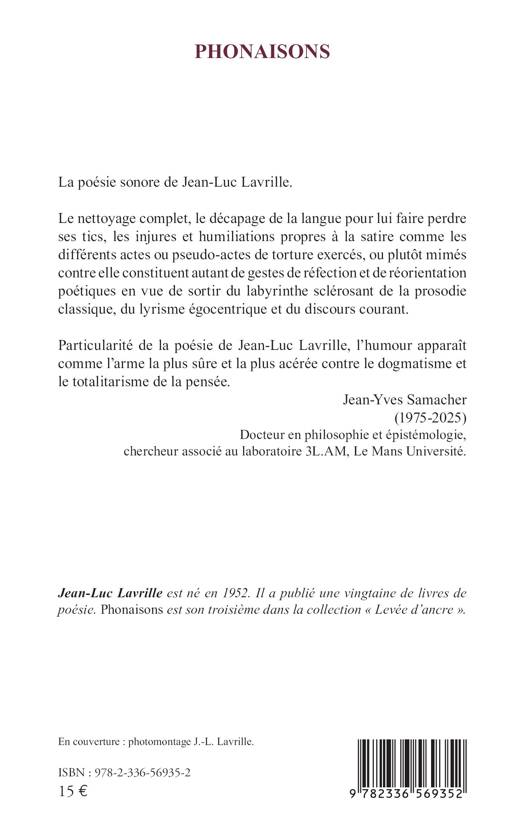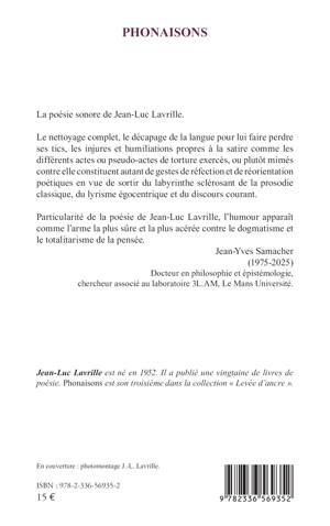 La poésie sonore de Jean-Luc Lavrille. Le nettoyage complet, le décapage de la langue pour lui faire perdre ses tics, les injures et humiliations propres à la satire comme les différents actes ou pseudo-actes de torture exercés, ou plutôt mimés contre elle constituent autant de gestes de réfection et de réorientation poétiques en vue de sortir du labyrinthe sclérosant de la prosodie classique, du lyrisme égocentrique et du discours courant. Particularité de la poésie de Jean-Luc Lavrille, l'humour apparaît comme l'arme la plus sûre et la plus acérée contre le dogmatisme et le totalitarisme de la pensée. (Jean-Yves Samacher (1975-2025), docteur en philosophie et épistémologie, chercheur associé au laboratoire 3L.AM, Le Mans)