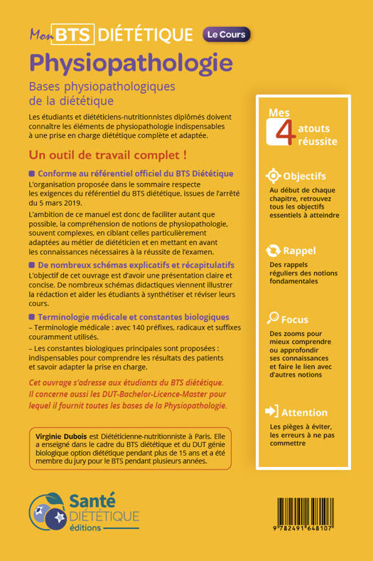 Un outil de travail complet !Les étudiants et diététiciens-nutritionnistes diplômés doivent connaître les éléments de physiopathologie indispensables à une prise en charge diététique complète et adaptée.• Conforme au référentiel officiel du BTS DiététiqueL’organisation proposée dans le sommaire respecte les exigences du référentiel du BTS diététique, issues de l’arrêté du 5 mars 2019.L’ambition de ce manuel est donc de faciliter autant que possible, la compréhension de notions de physiopathologie, souvent complexes, en ciblant celles particulièrement adaptées au métier de diététicien et en mettant en avant les connaissances nécessaires à la réussite de l’examen.• De nombreux schémas explicatifs et récapitulatifsL’objectif de cet ouvrage est d’avoir une présentation claire et concise. De nombreux schémas didactiques viennent illustrer la rédaction et aider les étudiants à synthétiser et réviser leurs cours.• Terminologie médicale et constantes biologiques- Terminologie médicale : avec 140 préfixes, radicaux et suffixes couramment utilisés.- Les constantes biologiques principales sont proposées : indispensables pour comprendre les résultats des patients et savoir adapter la prise en charge.Cibles :Cet ouvrage s’adresse aux étudiants du BTS diététique. Il concerne aussi les DUT-Bachelor-Licence-Master pour lequel il fournit toutes les bases de la Physiopathologie.Auteur :Virginie Dubois est Diététicienne-nutritionniste à Paris. Elle a enseigné dans le cadre du BTS diététique et du DUT génie biologique option diététique pendant plus de 15 ans et a été membre du jury pour le BTS pendant plusieurs années.