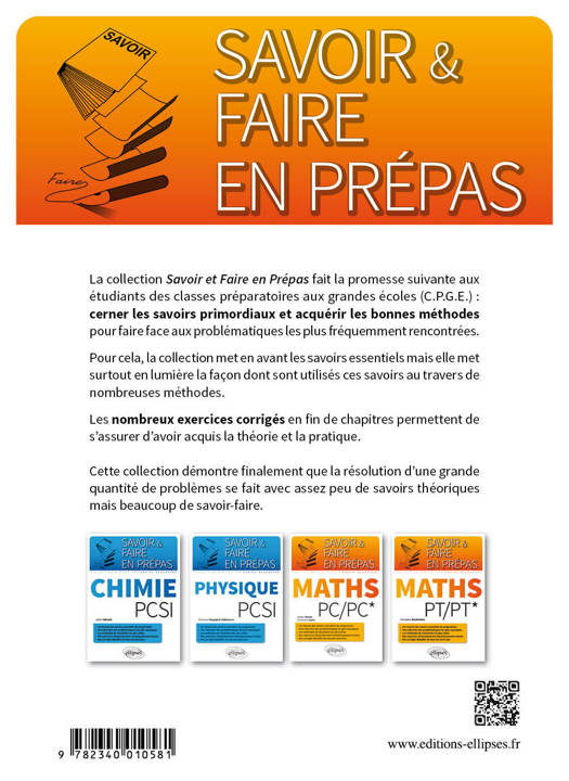 La collection Savoir et Faire en Prépas fait la promesse suivante aux étudiants des classes préparatoires aux grandes écoles (C.P.G.E.) : cerner les savoirs primordiaux et acquérir les bonnes méthodes pour faire face aux problématiques les plus fréquemment rencontrées.