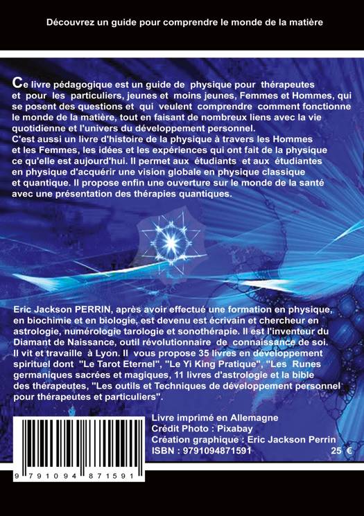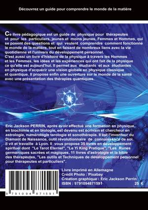 Ce livre pédagogique est un guide de physique pour thérapeutes et pour les particuliers, jeunes et moins jeunes, Femmes et Hommes, qui se posent des questions et qui veulent comprendre comment fonctionne le monde de la matière, tout en faisant de nombreux liens avec la vie quotidienne et l'univers du développement personnel. C'est aussi un livre d'histoire de la physique à travers les Hommes et les Femmes, les idées et les expériences qui ont fait de la physique ce qu'elle est aujourd'hui. Il permet aux étudiants et aux étudiantes en physique d'acquérir une vision globale en physique classique et quantique. Il propose enfin une ouverture sur le monde de la santé avec une présentation des thérapies quantiques.