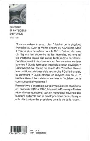 Nous connaissons assez bien l'histoire de la physique française au XVIIIe et même encore au XIXe siecle. Mais il n'en va plus de même pour le XXe : c'est un domaine où règnent les souvenirs et les légendes, où font foi les traditions orales que nul ne tente même de vérifier. Combien y avait-il de physiciens en France entre les deux guerres ? Quelle formatlon recevait le futur physicien ? Où travaillait-il au terme de ses études ? Quelles étaient les conditions publiques de la recherche ? Qui la finançait, et comment ? Quels étaient les moyens mis en jeu ? Quelles étaient les relations sociales à l'intérieur de la communauté physicienne ? Premier livre d'ensemble sur la physique et les physiciens en France de 1918 à 194 , le travail de Dominique Pestre répond à ces questions, tout en montrant l'influence des facteurs culturels sur le développement de la physique et le rôle joué par les physiciens dans la vie de la nation.