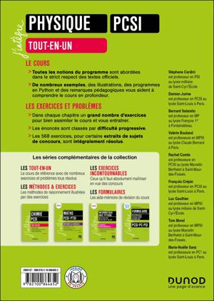 Ce « Tout-en-un » de physique PCSI est conforme aux programmes actuels. Il comporte : • Tout le cours PCSI traité dans le strict respect des programmes. • De nombreux exemples, des illustrations et des remarques pédagogiques pour vous aider à bien comprendre le cours. • De nombreux exercices d’entraînement, classés par difficulté progressive, pour bien assimiler le cours et vous entraîner. • Les corrigés détaillés de tous les exercices, intégralement résolus afin de pouvoir travailler en parfaite autonomie.