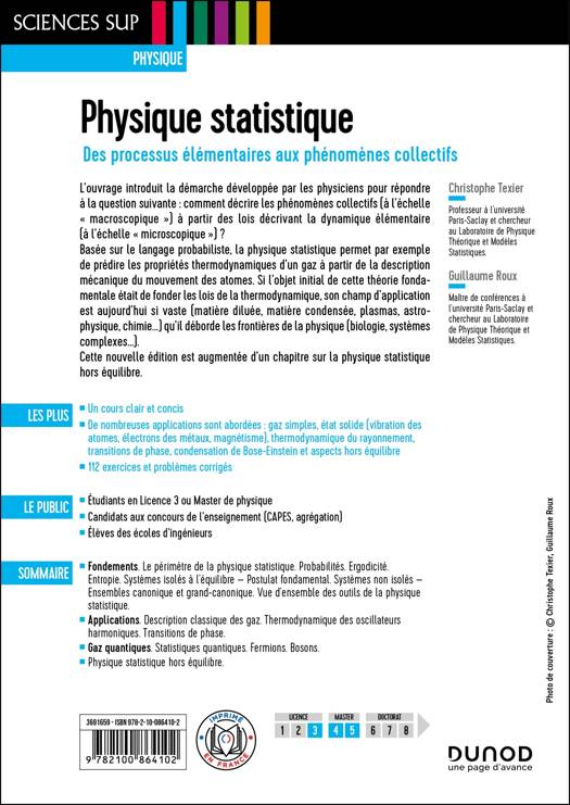 L’ouvrage introduit la démarche développée par les physiciens pour répondre à la question suivante : comment décrire les phénomènes collectifs (à l’échelle "macroscopique") à partir des lois décrivant la dynamique élémentaire (à l’échelle "microscopique") ? Basée sur le langage probabiliste, la physique statistique permet par exemple de prédire les propriétés thermodynamiques d’un gaz à partir de la description mécanique du mouvement des atomes. Si l’objet initial de cette théorie fondamentale était de fonder les lois de la thermodynamique, son champ d’application est aujourd’hui si vaste (matière diluée, matière condensée, plasmas, astrophysique, chimie…) qu’il déborde les frontières de la physique (biologie, systèmes complexes…). Cette nouvelle édition est augmentée d’un chapitre sur la physique statistique hors équilibre.