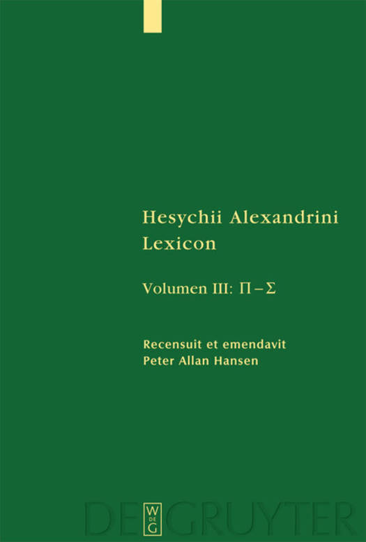 Hesychius' 5th(?)-century Greek lexicon is a very important survivor of ancient learning, including fragments of Greek literature and offering material, not yet fully evaluated, on patristic writings. The final critical edition was begun by Kurt Latte (Vol. 1, 1953 and Vol. 2, 1966, Copenhagen: Munksgaard; now out of print) and continued by Hansen (SGLG 11/3, 2005). Vol. 3, together with vol. 4 by Hansen and Cunningham (SGLG 11/4), provides for the first time a detailed report of the unique manuscript and a critical text, taking into account the relevant modern scholarship, and citing parallels from related works. A revised edition of the two Latte volumes followed (SGLG 11/1, 2017 and SGLG 11/2, 2019). A volume of indexes and addenda is planned (to be SGLG 11/5).