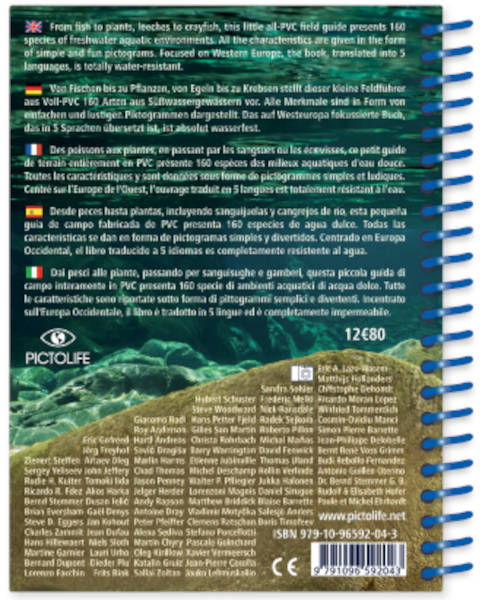 Des poissons aux plantes, en passant par les sangsues ou les écrevisses, ce petit guide de terrain entièrement en PVC présente 160 espèces des milieux aquatiques d'eau douce. Toutes les caractéristiques y sont données sous forme de pictogrammes simples et ludiques. Centré sur l'Europe de l'Ouest, l'ouvrage traduit en 5 langues est totalement résistant à l'eau.