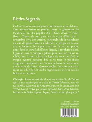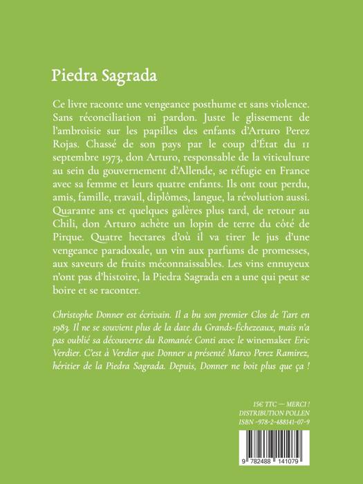 Ce livre raconte une vengeance posthume et sans violence. Sans réconciliation ni pardon. Juste le glissement de l’ambroisie sur les papilles des enfants d’Arturo Perez Rojas. Chassé de son pays par le coup d’État du 11 septembre 1973, don Arturo, responsable de la viticulture au sein du gouvernement d’Allende, se réfugie en France avec sa femme et leurs quatre enfants, âgés de 9 à 14 ans. Ils ont tout perdu, amis, famille, travail, diplômes, langue, la révolution aussi. Situation provisoire, qui va durer plus que prévu. Quarante ans et quelques galères plus tard, de retour au Chili, don Arturo achète un lopin de terre du côté de Pirque. Quatre hectares d’où il va tirer le jus d’une vengeance paradoxale, un vin aux parfums de promesses, aux saveurs de fruits méconnaissables. Les vins ennuyeux n’ont pas d’histoire, la Piedra Sagrada en a une qui peut se boire et se raconter.
