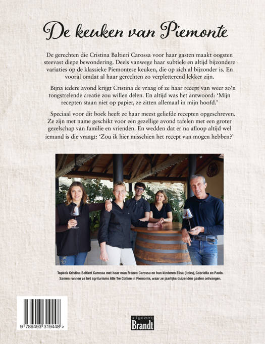 De keuken van Piemonte De gerechten die Cristina Baltieri Carossa voor haar gasten maakt oogsten steevast diepe bewondering. Deels vanwege haar subtiele en altijd bijzondere variaties op de klassieke Piemontese keuken, die op zich al bijzonder is. En vooral omdat al haar gerechten zo verpletterend lekker zijn. Bijna iedere avond krijgt Cristina de vraag of ze haar recept van weer zo’n tongstrelende creatie zou willen delen. En altijd was het antwoord: ‘Mijn recepten staan niet op papier, ze zitten allemaal in mijn hoofd.’ Speciaal voor dit boek heeft ze haar meest geliefde recepten opgeschreven. Ze zijn met name geschikt voor een gezellige avond tafelen met een groter gezelschap van familie en vrienden. En wedden dat er na afloop altijd wel iemand is die vraagt: ‘Zou ik hier misschien het recept van mogen hebben?’
