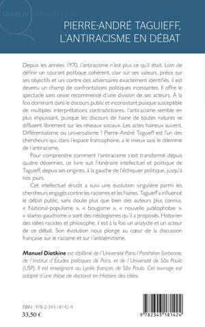 Pour comprendre comment l'antiracisme s'est transformé depuis quatre décennies, ce livre suit l'itinéraire intellectuel et politique de Taguieff, depuis ses origines, à la gauche de l'échiquier politique, jusqu'à nos jours. Cet intellectuel érudit a suivi une évolution singulière parmi les chercheurs engagés contre les racismes et les haines. Taguieff a influencé le débat public, sans doute plus que bien des auteurs plus connus (...). Historien des idées racistes en philosophie, il est à la fois in analyste et un acteur de ce débat. Son évolution nous plonge au cœur de la discussion française sur le racisme et l'antisémitisme.