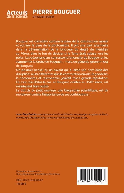 Bouguer est considéré comme le père de la construction navale et comme le père de la photométrie. Il prit une part essentielle dans la détermination de la longueur du degré de méridien au Pérou, dans le but de décider si la Terre était aplatie vers les pôles. Les géophysiciens connaissent l'anomalie de Bouguer et les astronomes la droite de Bouguer. Mais, en général, ils ignorent tout de Bouguer. On pourrait penser qu'un savant qui a laissé son nom dans des disciplines aussi différentes que la construction navale, la géodésie, la photométrie et l'astronomie, jouirait d'une grande réputation. Or c'est loin d'être le cas, et Bouguer, célèbre au XVIIIe siècle, est maintenant bien oublié. Le but de ce petit ouvrage, une biographie scientifique, est de mettre en lumière l'importance de ses contributions.