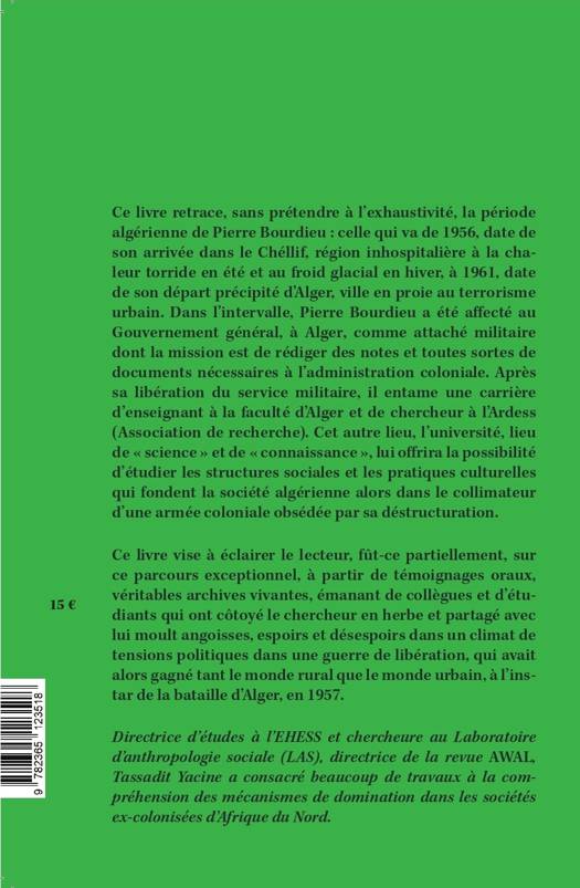 Ce livre n’a pas pour objet de donner une vision exhaustive de la période algérienne de Pierre Bourdieu : celle qui va de 1956, date de son arrivée dans le Cheliff, région inhospitalière chaleur torride en été et froid glacial, en hiver, à 1961, date de son départ précipité d’Alger, devenue la proie du terrorisme urbain . Il vise cependant à éclairer le lecteur, fût-ce partiellement, à partir de témoignages oraux, véritables archives vivantes, émanant de collègues et d’étudiants qui l’ont côtoyé et partagé avec lui moult angoisses, espoirs et désespoirs dans un climat de tensions politiques dans un conflit de guerre ayant gagne tant le monde rural que dans le monde urbain, à l’instar de la bataille d’Alger, en 1957. Avant de poursuivre, un aperçu historique de l’histoire de l’Algérie peut aider à mieux comprendre cette période. Colonisée en 1830, l’Algérie, va connaître de changement réel que sous la IVe et la Ve République. Liée à la France, elle subira les soubresauts de la politique de la Métropole en sus de ses propres affaires. L’Algérie, c’est assurément la France, mais la France n’est pas l’Algérie dans la mesure où une minorité (les colons) faisait sa propre loi en défiant la Métropole. Jean Amrouche « aimait à dire, pendant la guerre, que Paris capitule souvent devant Alger ». C’est l’année 1945 qui va constituer un tournant déterminant ayant marqué le XXe siècle. Libérée de l’Allemagne, la France va devoir régler la question des colonies : l’Indochine, le Maroc, la Tunisie, Madagascar. Les élites et les soldats indigènes ayant combattu le nazisme au retour du front réclament le droit à l’émancipation de leurs peuples. C’est dans ce contexte que des manifestations pacifiques à Sétif, Guelma et Kherrata (8 mai 1945) ont fini dans un bain de sang faisant plusieurs milliers de morts en quelques jours seulement. Le vent de la décolonisation avait donc commencé à souffler. En France, le général de Gaulle et ses compagnons avaient pris le pouvoir. Il fallait d’abord rétablir l’économie française et gérer les questions internationales en accordant une place moindre aux affaires indigènes, ce qui va se traduire par une conscience généralisée au sein du peuple mais surtout chez les élites « musulmanes ». Des écrivains, à l’instar de Jean Amrouche, Kateb Yacine, Mohammed Dib, Mouloud Mammeri et d’autres encore pour lesquels cette date fut une véritable rupture avec le système colonial. Déjà avec l’échec du projet Blum Viollette en 1936, les Algériens avaient compris que les promesses d’égalité n’étaient plus à l’ordre du jour. À côté du Parti du peuple algérien (PPA), parti indépendantiste de Messali Hadj, d’autres se radicalisèrent (comme celui de Ferhat Abbas, par exemple) et tous sur les mêmes positions : l’indépendance de l’Algérie. Des figures importantes de la résistance comme : Jacques Soustelle, Robert Lacoste, Germaine Tillion, Vincent Montheil, etc. sont appelés en Algérie. Parmi eux de nombreux gaullistes, il y avait diverses appartenances politiques de droite comme de gauche, tous favorables à l’Algérie française, y compris de grandes personnalités politiques qui pensaient qu’il ne fallait pas amputer « l’empire » d’une de ses plus belles colonies, comme Soustelle. Un autre événement est également déterminant dans l’histoire des colonies françaises : Diên Biên Phu qui fut une brèche dans le système colonial. Cette défaite cuisante de la France au Vietnam n’est pas sans conséquences sur l’Algérie puisque tous les militaires seront rapatriés vers la colonie où ils prendront leur revanche sur les Algériens. Du côté algérien, cette même date marque la déclaration de la guerre à la France, ce fut le 1er novembre 1954. Le front de libération nationale entre officiellement en guerre. Des officiers de l’armée française, nombreux à être humiliés par cette atroce défaite se retrouvent à Alger mais aussi des intellectuels. En cette période, une figure importante se détache : Mendès France, un des politiques français les plus éclairés – président du Conseil (libéral), il a travaillé à l’indépendance de la Tunisie et du Maroc (1956) mais il a été empêché d’en faire autant pour l’Algérie si ce n’est de nommer un résident général, Jacques Soustelle, dont il attendait une gestion réformiste et une politique un tant soit peu égalitariste face aux gros colons, comme Henri Borgeaud . Ces derniers avaient fait main basse sur le pays qu’ils considéraient comme leur propriété personnelle. Grands propriétaires, ils avaient aussi la mainmise sur la chambre de commerce, la presse et la politique en Algérie et, parallèlement, ils faisaient la pluie et le beau temps dans les cercles politiques à Paris. Mendès France essuya un revers, car Jacques Soustelle – homme de gauche – ne tarda pas à devenir un défenseur acharné de Algérie française et finira à l’extrême droite. La vision de Mendès France aura une influence sur les libéraux en Algérie qui iront en vain à la recherche d’une troisième voie. En dehors de De Gaulle, qui est le président français le plus connu de la période et qui « donnera » l’indépendance aux Algériens, il y a eu également Guy Mollet, président du Conseil, socialiste), en 1956, boycotté par les Pieds-noirs (population européenne très minoritaire), qui fera voter les pouvoirs spéciaux, ces derniers autorisent la police à recourir à la torture pour extorquer l’information. Les pouvoirs spéciaux furent majoritairement votés, y compris par les partis de gauche, communistes inclus. Après plusieurs jours de voyage en bateau, le débarquement pour ce jeune métropolitain n’a pas été des plus accueillants. Il arrive à Lavarande, un petit bourg (actuellement Sidi Lakhdar) où l’ennui le dispute a