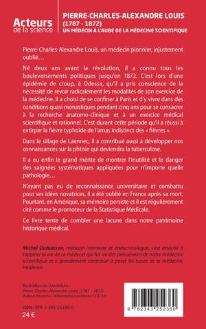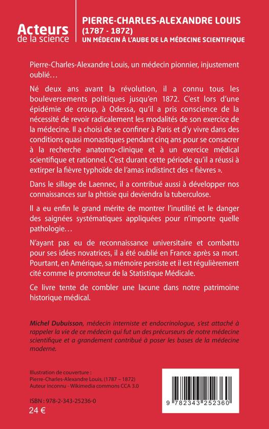 Pierre-Charles-Alexandre Louis, un médecin pionnier, injustement oublié. Né deux ans avant la révolution, il a connu tous les bouleversements politiques jusqu’en 1872. C’est lors d’une épidémie de croup, à Odessa, qu’il a pris conscience de la nécessité de revoir radicalement les modalités de son exercice de la médecine. Il a choisi de se confiner à Paris et d’y vivre dans des conditions quasi monastiques pendant cinq ans pour se consacrer à la recherche anatomo-clinique et à un exercice médical scientifique et rationnel. C’est durant cette période qu’il a réussi à extirper la fièvre typhoïde de l’amas indistinct des « fièvres ». Dans le sillage de Laennec, il a contribué aussi à développer nos connaissances sur la phtisie qui deviendra la tuberculose. Il a eu enfin le grand mérite de montrer l’inutilité et le danger des saignées systématiques appliquées pour n’importe quelle pathologie.