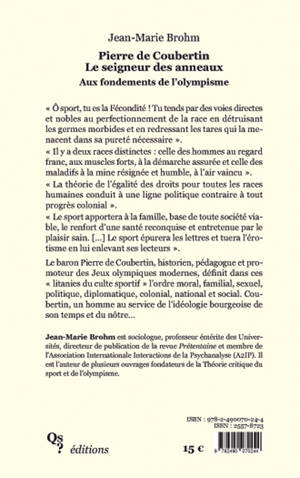 « Ô sport, tu es la Fécondité ! Tu tends par des voies directes et nobles au perfectionnement de la race en détruisant les germes morbides et en redressant les tares qui la menacent dans sa pureté nécessaire ». « Il y a deux races distinctes : celle des hommes au regard franc, aux muscles forts, à la démarche assurée et celle des maladifs à la mine résignée et humble, à l’air vaincu ». « La théorie de l’égalité des droits pour toutes les races humaines conduit à une ligne politique contraire à tout progrès colonial ». « Le sport apportera à la famille, base de toute société viable, le renfort d’une santé reconquise et entretenue par le plaisir sain. […] Le sport épurera les lettres et tuera l’érotisme en lui enlevant ses lecteurs ». Le baron Pierre de Coubertin, historien, pédagogue et promoteur des Jeux olympiques modernes, définit dans ces « litanies du culte sportif » l’ordre moral, familial, sexuel, politique, diplomatique, colonial, national et social. Coubertin, un homme au service de l’idéologie bourgeoise de son temps et du nôtre…
