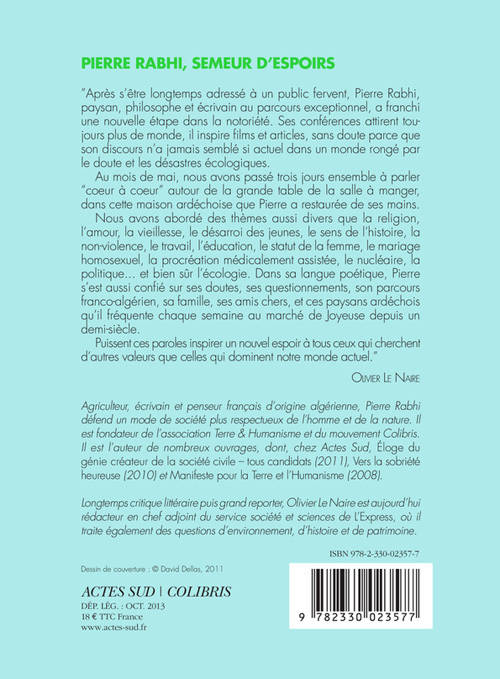 Après s'être longtemps adressé à un public fervent, Pierre Rabhi, paysan, philosophe et écrivain au parcours exceptionnel, a franchi une nouvelle étape dans la notoriété. Ses conférences attirent toujours plus de monde, il inspire films et articles, sans doute parce que son discours n'a jamais semblé si actuel dans un monde rongé par le doute et les désastres écologiques.