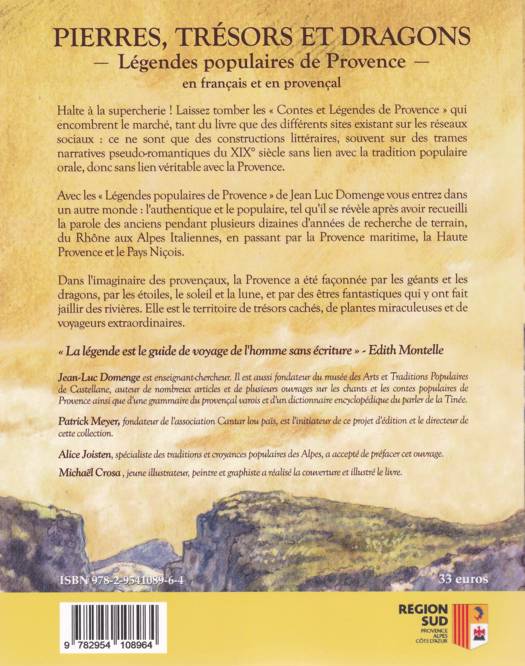 PIERRES, TRESORS ET DRAGONS : Légendes populaires de Provence - en français et en provençal - « La légende est le guide de voyage de l’homme sans écriture » (Edith Montelle) Si la Provence est ce qu’elle est aujourd’hui, c’est qu’elle a été façonnée par les géants et les dragons, par les étoiles, le soleil et la lune, et par des êtres fantastiques qui y ont fait jaillir des rivières. Elle est le territoire de trésors cachés, de plantes miraculeuses et de voyageurs extraordinaires. Telle est du moins l'histoire que racontaient les anciens, de bouche à oreille, le plus souvent en provençal, depuis la nuit des temps. LES SEPT CHAPITRES DU LIVRE - Le combat des géants et l'origine du monde - Les plantes (et leurs légendes) - Les animaux de Dieu et du Diable - La création de l'homme et de la femme - Le temps de l'histoire (Saints et voyageurs) - Dragons et autres créatures - Les temps et les lieux (depuis l'antiquité)