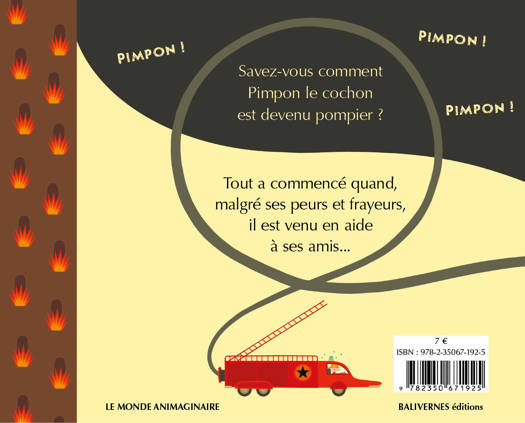 Pimpon est un petit peu peureux. Il a peur d'aller dans l'eau, il a peur de grimper très haut. Mais quand pour secourir ses amis, il deviendra intrépide et plein de courage. Il découvrira alors qu'il est fait pour être pompier, et aura même droit au camion rouge et à l'uniforme ! Ce tome de la série du Monde Animaginaire aborde l'un des mondes préférés des enfants : celui des pompiers qui viennent en aide à tous et dans de nombreuses situations différentes. Le camion rouge, l'échelle, la lance à incendie sont bien sûr présents, mais les autres actions des pompiers sont aussi évoquées. La dernière double-page rappelle de façon très simple comment appeler les pompiers, tout en insistant sur le point important qu'il ne faut jamais les déranger pour rien.