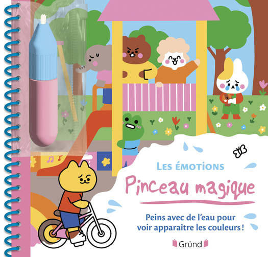 C'est magique ! Il te suffit de remplir ton pinceau avec de l'eau, puis de le passer sur les 6 décors de ton carnet pour voir apparaître en couleurs d'adorables illustrations sur les émotions : la tristesse, la joie, la colère, la peur, la fierté... Attends un peu : les couleurs disparaissent à nouveau pour que tu puisses recommencer à l'infini !