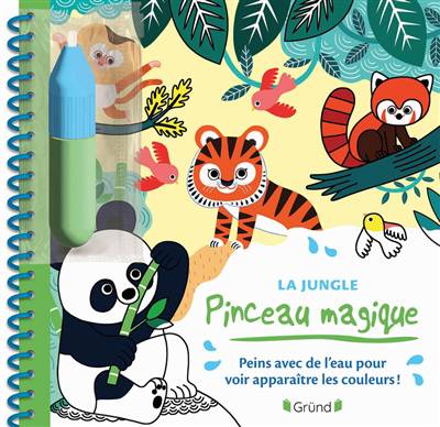Peins avec de l'eau, et regarde les animaux de la jungle apparaître en couleurs ! C'est magique ! Il suffit de remplir son pinceau avec de l'eau, puis de le passer sur les 6 décors du carnet pour voir apparaître des scènes et animaux de la jungle : des singes dans les lianes, un petit lézard dans les ruines, un bébé jaguar au lever du jour, un panda dans la forêt de bambou...