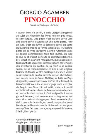 « Aucun livre n'a de fin, a écrit Giorgio Manganelli au sujet de Pinocchio. Les livres ne sont pas longs, ils sont larges. Une page n'est qu'une porte vers une autre porte, ouvrant sur une autre porte. Finir un livre, c'est en ouvrir la dernière porte, de sorte qu'aucune porte ne se ferme jamais plus. » C'est une porte de ce type qu'ouvre Giorgio Agamben avec ce double commentaire, trois fois illustré, du livre le plus lu et traduit de toute la littérature italienne. Et il le fait en écartant résolument, mais aussi en reformulant à la source les interprétations ésotériques des aventures du pantin, de sa mort à sa renaissance, de sa métamorphose en âne à son engloutissement dans le ventre du Requin. C'est en vivant ses aventures de pantin, la vente de son abécédaire, son entrée dans le Grand Théâtre, sa fuite au Pays des jouets, sa rencontre avec le Chat et le Renard, sa transformation en âne et son voyage dans le ventre du Requin que Pinocchio est initié ; mais ce à quoi il est initié est sa vie même. Le livre qui en résulte n'est ni une fable ni un roman, il n'est assignable à aucun genre littéraire ; tout comme son protagoniste, qui n'est ni un animal ni un garçon : il est, au sens le plus strict, une voie de sortie, ou une échappatoire, aussi bien hors de l'humain que de l'inhumain - c'est pour cela qu'il ne fait que courir, et que quand il s'arrête, à la fin, il est perdu.