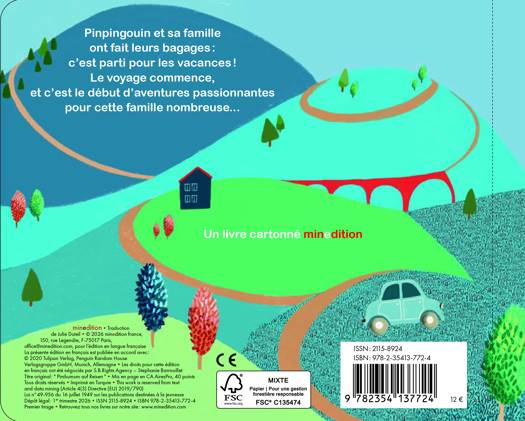 Une histoire qui ravira tous ceux qui sont déjà partis en vacances en famille ! Pinpingouin et sa famille ont fait leurs bagages : c'est parti pour les vacances ! Le voyage commence, et c'est le début d'aventures passionnantes pour cette famille nombreuse... et d'abord, comment faire rentrer toutes ces valises dans la petite voiture ?