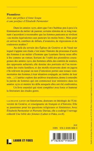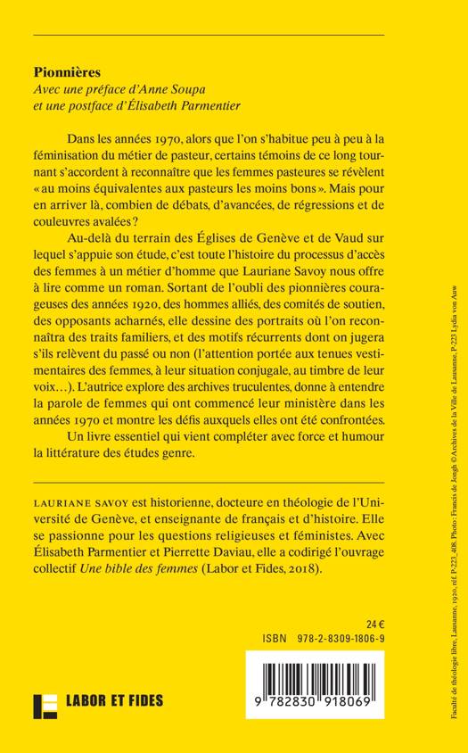 Des femmes pasteures qui célèbrent le culte, qui prêchent du haut de la chaire, qui baptisent, qui rompent le pain, élèvent la coupe et distribuent la Sainte Cène; des femmes qui animent le catéchisme, accompagnent les familles endeuillées et bénissent les couples mariés: cela fait presque un siècle qu’il y a en a, dans certaines Églises protestantes réformées! Leur arrivée ne s’est pas faite sans débats et sans difficultés. Lauriane Savoy propose une étude fouillée du processus à l’œuvre dans les Églises de Genève et Vaud, faisant sortir de l’oubli des pionnières courageuses des années 1920, des hommes alliés, des comités de soutien, des opposants acharnés. Elle explore des archives truculentes, donne à entendre la parole de femmes qui ont commencé leur ministère dans les années 1970 et racontent leur vocation, montre la conciliation délicate entre leur engagement et leur vie de famille. En un siècle, les Églises protestantes réformées sont passées du monopole masculin sur le pastorat à une proportion de près de 40% de femmes pasteures. Cette révolution méconnue, particulière au protestantisme, donne à penser sur les défis auxquels femmes et hommes sont confrontés encore aujourd’hui.
