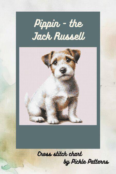 The cross stitch chart is a portrait of a seated Jack Russell puppy with white, tan and black markings. The dog is the focus of the image with no clutter from background elements.