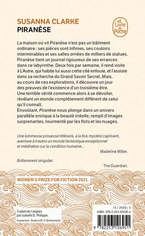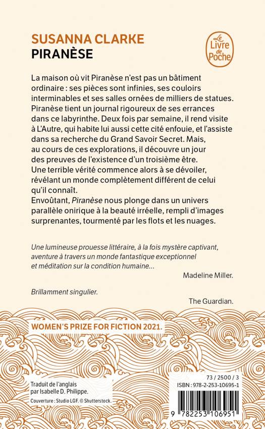 La maison où vit Piranèse n’est pas un bâtiment ordinaire : ses pièces sont infinies, ses couloirs interminables et ses salles ornées de milliers de statues. Piranèse tient un journal rigoureux de ses errances dans ce labyrinthe. Deux fois par semaine, il rend visite à L’Autre, qui habite lui aussi cette cité enfouie, et l’assiste dans sa recherche du Grand Savoir. Mais, au cours de ces explorations, Piranèse découvre un jour des preuves de l’existence d’un troisième être. Une terrible vérité commence alors à se dévoiler, révélant un monde complètement différent de celui qu’il connaît. Envoûtant, Piranèse nous plonge dans un univers parallèle onirique à la beauté irréelle, rempli d’images surprenantes, tourmenté par les flots et les nuages.