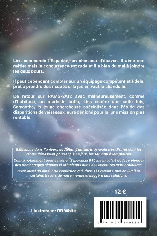 Secondé par un équipage compétent, fidèle et prêt à prendre des risques, Liss, qui commande l'Espadon, un chasseur d'épaves, aime son métier mais peine à en vivre en raison de la rude concurrence qui sévit. De retour sur RAMS_2A12 avec un modeste butin, il espère que Samantha, une jeune chercheuse spécialisée dans la disparition de vaisseaux, déniche pour lui une mission plus rentable.