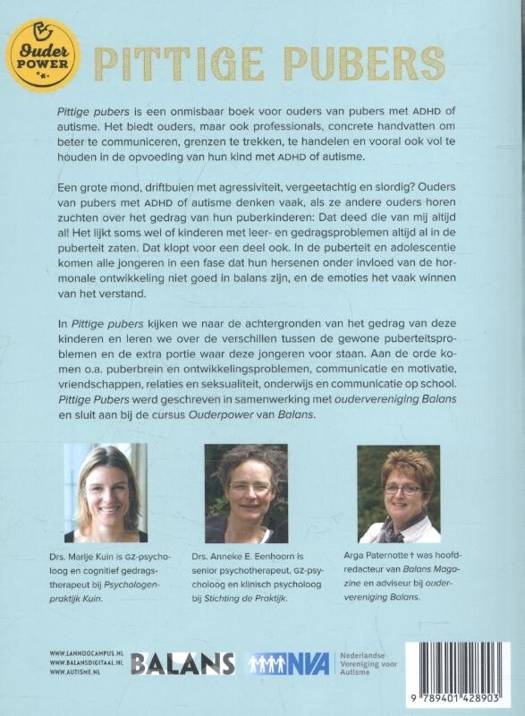 De opvoeding van je puber met leer- en gedragsproblemen Pittige pubers is een onmisbaar boek voor ouders van pubers met ADHD of autisme. Het biedt ouders, maar ook professionals, concrete handvatten om beter te communiceren, grenzen te trekken, te handelen en vooral ook vol te houden in de opvoeding van hun kind met ADHD of autisme. Een grote mond, driftbuien met agressiviteit, vergeetachtig en slordig? Ouders van pubers met ADHD of autisme denken vaak, als ze andere ouders horen zuchten over het gedrag van hun puberkinderen: Dat deed die van mij altijd al! Het lijkt soms wel of kinderen met leer- en gedragsproblemen altijd al in de puberteit zaten. Dat klopt voor een deel ook. In de puberteit en adolescentie komen alle jongeren in een fase dat hun hersenen onder invloed van de hormonale ontwikkeling niet goed in balans zijn, en de emoties het vaak winnen van het verstand. In Pittige pubers kijken we naar de achtergronden van het gedrag van deze kinderen en leren we over de verschillen tussen de gewone puberteitsproblemen en de extra portie waar deze jongeren voor staan. Aan de orde komen o.a. puberbrein en ontwikkelingsproblemen, communicatie en motivatie, vriendschappen, relaties en seksualiteit, onderwijs en communicatie op school. Pittige Pubers werd geschreven in samenwerking met oudervereniging Balans en sluit aan bij de cursus Ouderpower van Balans.