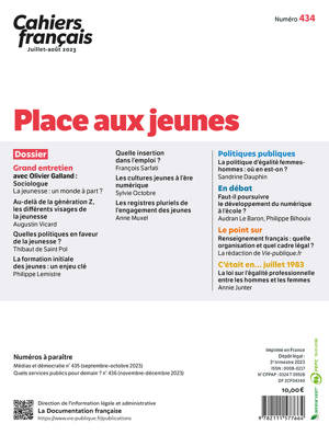 Ce dossier de Cahiers français se propose de scruter la situation actuelle de la jeunesse en s’attachant à dépasser les représentations convenues et les stéréotypes. Il vise également à faire le point sur les politiques menées en direction de la jeunesse pour sa formation, son insertion dans le monde du travail et la résorption des inégalités dont cette jeunesse pâtît souvent. Il apparaît nécessaire de comprendre les évolutions d’une classe d’âge qui semble s’allonger à mesure qu’augmente l’espérance de vie. Quelle place occupe aujourd’hui cette jeunesse dans la société ? Quels sont les aspirations et ses préoccupations au-delà de la question du réchauffement climatique ? Comment favoriser son insertion dans le monde adulte et en particulier dans le monde du travail ?