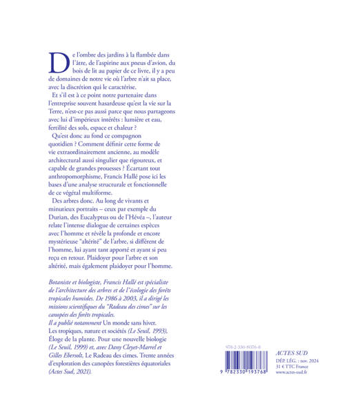 De l'ombre des jardins à la flambée dans l'âtre, de l'aspirine aux pneus d'avion, du bois de lit au papier de ce livre, il y a peu de domaines de notre vie où l'arbre n'ait sa place, avec la discrétion qui le caractérise. Et s'il est à ce point notre partenaire dans l'entreprise souvent hasardeuse qu'est la vie sur la Terre, n'est-ce pas aussi parce que nous partageons avec lui d'impérieux intérêts : lumière et eau, fertilité des sols, espace et chaleur ? Qu'est donc au fond ce compagnon quotidien ? Comment définir cette forme de vie extraordinairement ancienne, au modèle architectural aussi singulier que rigoureux, et capable de grandes prouesses ? Écartant tout anthropomorphisme, Francis Hallé pose ici les bases d'une analyse structurale et fonctionnelle de ce végétal multiforme. Des arbres donc. Au long de vivants et minutieux portraits - ceux par exemple du Durian, des Eucalyptus ou de l'Hévéa -, l'auteur relate l'intense dialogue de certaines espèces avec l'homme et révèle la profonde et encore mystérieuse « altérité » de l'arbre, si différent de l'homme, lui ayant tant apporté et ayant si peu reçu en retour. Plaidoyer pour l'arbre et son altérité, mais également plaidoyer pour l'homme.
