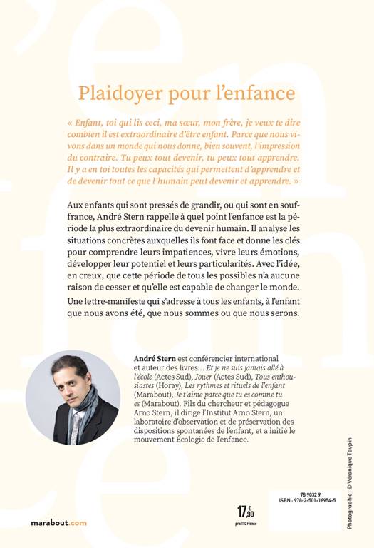 Aux enfants qui sont pressés de grandir, ou qui sont en souffrance, André Stern rappelle à quel point l’enfance est la période la plus extraordinaire du devenir humain. Il analyse les situations concrètes auxquelles ils font face et donne les clés pour comprendre leurs impatiences, vivre leurs émotions, développer leur potentiel et leurs particularités. Avec l’idée, en creux, que cette période de tous les possibles n’a aucune raison de cesser et qu’elle est capable de changer le monde.