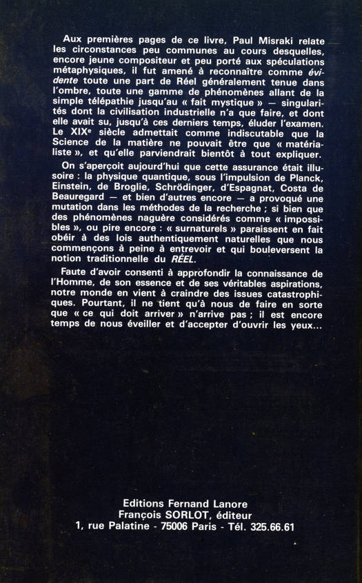 Aux premières pages de ce livre, Paul Misraki relate les circonstances peu communes au cours desquelles, encore jeune compositeur et peu porté aux spéculations métaphysiques, il fut amené à reconnaître comme évidente toute une part de Réel généralement tenue dans l’ombre, toute une gamme de phénomènes allant de la simple télépathie jusqu’au « fait mystique ».
