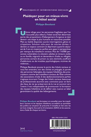 Ultime refuge pour les personnes fragilisées que l’on n’accueille plus ailleurs, l’hôtel social fait désormais partie des propositions d’hébergement d’urgence et doit devenir une étape la plus humaine et rassurante possible. Mais sa réalité disparate suscite interrogations, gênes et crispations. Solution utile pour de courtes durées, il devient un espace contraint et déprimant quand le séjour est de 3 ans en moyenne, parfois sans appui ni perspectives par manque de travailleurs sociaux. Plus de 110 000 personnes vulnérables s’y côtoient : adultes et mineurs, isolés ou en famille, migrants et demandeurs d’asile ou réfugiés, personnes sortant de prison ou sans domicile, souffrant d’addictions ou de troubles psychologiques, victimes de violences… Philippe Baudassé pousse la porte des hôtels sociaux et nous fait entendre, loin des clichés et préjugés, la parole des personnes hébergées, des équipes hôtelières, des prescripteurs comme des travailleurs sociaux, de l’État comme des associations d’aide. Si des dysfonctionnements parfois tragiques écornent l’image des hôtels sociaux, beaucoup de professionnels oeuvrent avec conviction pour en faire des lieux de vie qui préservent de la rue et ouvrent vers l’avenir. Il est indispensable de promouvoir la formation des équipes hôtelières et de définir avec nuance un label garantissant la qualité des hébergements.