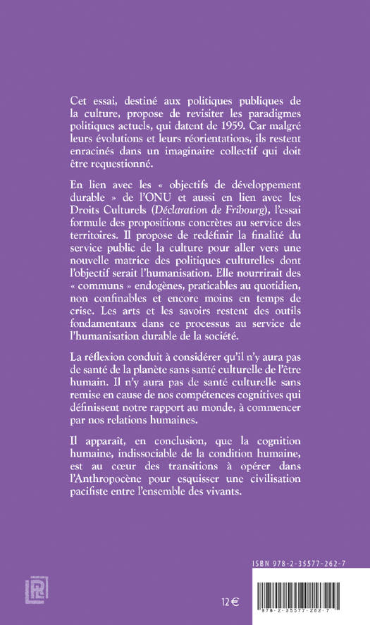 Destiné aux politiques publiques de la culture, cet essai propose de revisiter les paradigmes politiques actuels, qui datent de 1959. En lien avec les « objectifs de développement durable » de l'ONU et avec les Droits Culturels (Déclaration de Fribourg), l'essai formule des propositions concrètes au service des territoires. L’ouvrage propose de redéfinir la finalité du service public de la culture pour aller vers une nouvelle matrice des politiques culturelles dont l'objectif serait l'humanisation, qui nourrirait des « communs » endogènes, praticables au quotidien. Les arts et les savoirs restant des outils fondamentaux dans ce processus au service de l'humanisation durable de la société. La réflexion conduit à considérer qu'il n'y aura pas de santé de la planète sans santé culturelle de l'être humain. Il n'y aura pas de santé culturelle sans remise en cause de nos compétences cognitives qui définissent notre rapport au monde, à commencer par nos relations humaines.