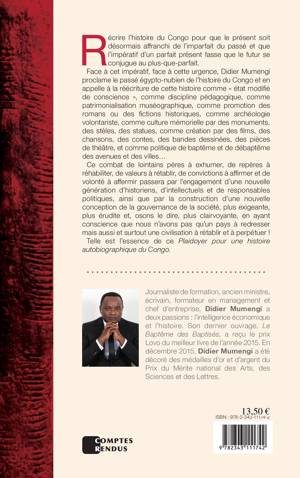 Réécrire l'histoire du Congo pour que le présent soit désormais affranchi du passé. L'auteur proclame le passé égypto-nubien de l'histoire du Congo et en appelle à la réécriture de cette histoire comme discipline pédagogique, comme patrimonialisation muséographique, comme promotion des romans ou fictions historiques, comme archéologie volontariste, comme culture mémorielle, comme création par des films, chansons, contes, et comme politique de baptême et de débaptême des avenues et des villes... Ce combat de lointains pères à exhumer, de repères à réhabiliter, de valeurs à rétablir, de convictions à affirmer et de volonté à affermir passera par l'engagement d'une nouvelle génération d'historiens, d'intellectuels et de responsables politiques.