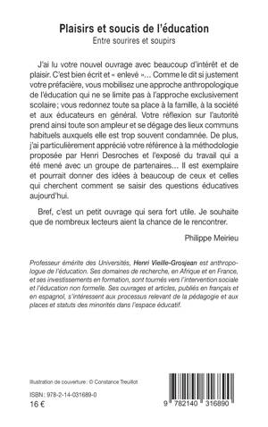 "J'ai lu votre nouvel ouvrage avec beaucoup d'intérêt et de plaisir. C'est bien écrit et « enlevé » Comme le dit si justement votre préfacière, vous mobilisez une approche anthropologique de l'éducation qui ne se limite pas à l'approche exclusivement scolaire ; vous redonnez toute sa place à la famille, à la société et aux éducateurs en général. Votre réflexion sur l'autorité prend ainsi toute son ampleur et se dégage des lieux communs habituels auxquels elle est trop souvent condamnée. De plus, j'ai particulièrement apprécié votre référence à la méthodologie proposée par Henri Desroches et l'exposé du travail qui a été mené avec un groupe de partenaires Il est exemplaire et pourrait donner des idées à beaucoup de ceux et celles qui cherchent comment se saisir des questions éducatives aujourd'hui. Bref, c'est un petit ouvrage qui sera fort utile. Je souhaite que de nombreux lecteurs aient la chance de le rencontrer." Philippe Meirieu