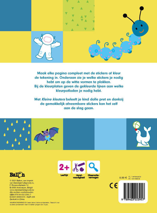 Superleuk stickerboek met meer dan 290 stickers voor 2-jarige peuterhandjes. Maak elke pagina compleet met de stickers of kleur de tekening in. Onderaan zie je welke stickers je nodig hebt om op de witte vormen te plakken. Bij de kleurplaten geven de gekleurde lijnen aan welke kleurpotloden je nodig hebt. Met Kleine kleuters beleeft je kind dolle pret en dankzij de gemakkelijk afneembare stickers kan het zelf aan de slag gaan.